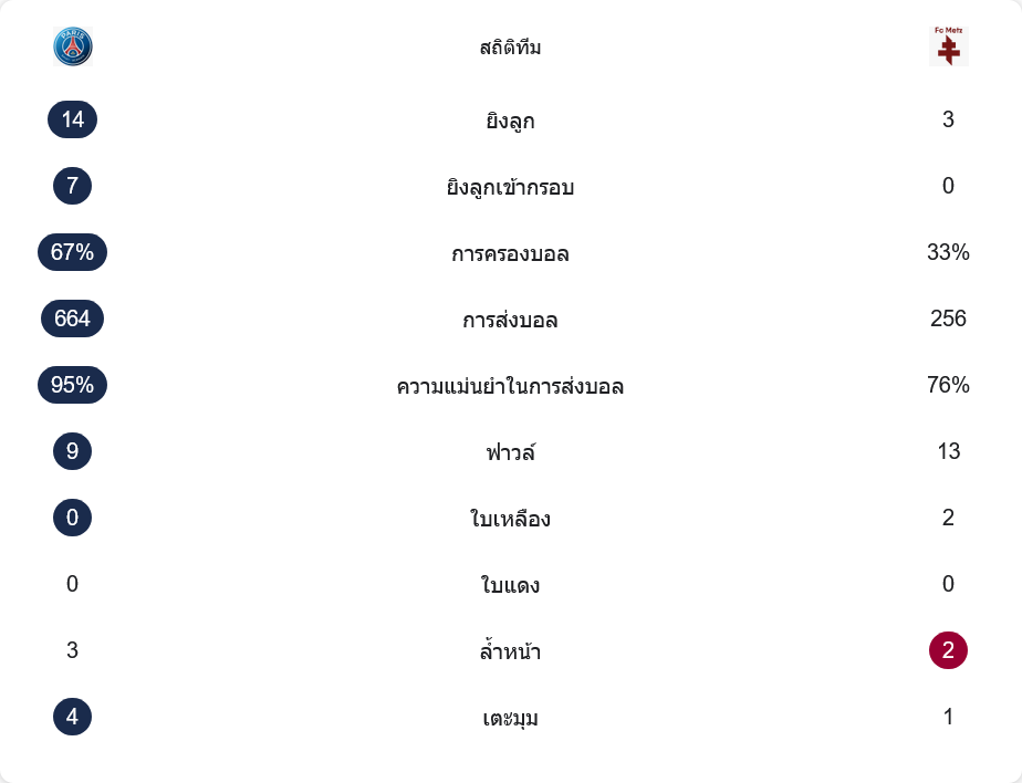 เกมนี้เปแอสเชครองเกมแบบเบ็ดเสร็จ ยิงทั้งหมด 14 ครั้ง และยิงเข้ากรอบ 7 ครั้ง ขณะที่เม็ตซ์ยิงได้เพียง 3 ครั้งและไม่มีลูกเข้ากรอบเลย การครองบอลเป็นของเจ้าถึง 67 เปอร์เซ็นต์ แถมจ่ายบอลมากถึง 664 ครั้งด้วยความแม่นยำ 95 เปอร์เซ็นต์ ต่างจากเม็ตซ์ที่จ่าย 256 ครั้ง ความแม่นยำ 76 เปอร์เซ็นต์ ภาพรวมสะท้อนชัดว่าบอลอยู่กับเจ้าถิ่นเป็นส่วนใหญ่ เกมมีการฟาวล์รวมพอสมควรโดยเม็ตซ์ฟาวล์ 13 ครั้งมากกว่าเปแอสเชที่ 9 ครั้ง และทีมเยือนได้ใบเหลือง 2 ใบ ส่วนลูกล้ำหน้า เปแอสเช 3 ครั้ง เม็ตซ์ 2 ครั้ง ขณะที่เตะมุมเจ้าถิ่นได้ 4 ครั้ง เม็ตซ์ได้ 1 ครั้ง