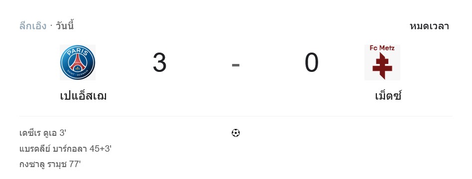 บ้านกีฬา ขอสรุปเกม ผลบอลสด ลีกเอิง ฝรั่งเศส นัดที่ เปแอสเช เปิดบ้านอัด เม็ตซ์ 3-0 แบบคุมทุกจังหวะ ตั้งแต่ต้นจนจบ เกมนี้เจ้าถิ่นมาในระบบ 4-3-3 เดินหน้ากดดันสูง บีบให้ทีมเยือนเล่นพลาดซ้ำๆ จนโดนลงโทษเป็นสกอร์เร็วตั้งแต่นาที 3 แล้วค่อยๆ ตอกย้ำความต่างด้วยประตูที่สองก่อนพักครึ่ง และปิดกล่องช่วงท้ายอย่างเด็ดขาด