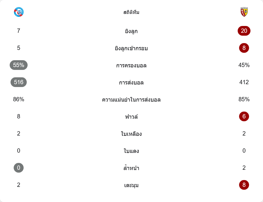 ภาพรวมเกมเป็นของล็องส์ในแง่ความดุดันแบบตัวเลข พวกเขายิงทั้งหมด 20 ครั้ง เข้ากรอบ 8 ครั้ง ขณะที่สตราส์บูร์กยิง 7 ครั้ง เข้ากรอบ 5 ครั้ง แต่เจ้าบ้านคุมบอลได้มากกว่า 55 เปอร์เซ็นต์ และจ่ายบอลมากถึง 516 ครั้ง ความแม่นยำ 86 เปอร์เซ็นต์ บ่งบอกว่าพวกเขาเน้นคุมจังหวะและความชัวร์ ส่วนล็องส์ครองบอล 45 เปอร์เซ็นต์ จ่าย 412 ครั้ง แม่นยำ 85 เปอร์เซ็นต์ เน้นเร่งเกมและแทงขึ้นหน้าเร็ว จังหวะฟาวล์สตราส์บูร์ก 8 ครั้ง ล็องส์ 6 ครั้ง ใบเหลืองฝั่งละ 2 ใบ ไม่มีใบแดง ที่ต่างกันชัดคือเตะมุม ล็องส์ได้ถึง 8 ครั้ง ส่วนสตราส์บูร์กได้ 2 ครั้ง และล้ำหน้าล็องส์ 2 ครั้ง สตราส์บูร์ก 0 ครั้ง