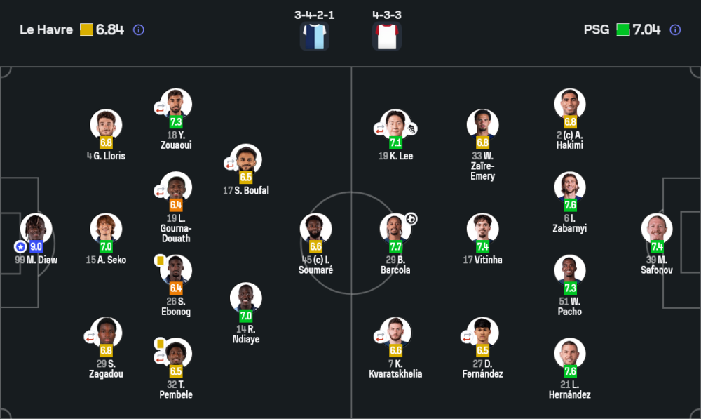 Mory Diaw นายทวารเลอ อาฟร์ คว้ารางวัลผู้เล่นยอดเยี่ยมด้วยคะแนน 9.0 แบบไร้ข้อกังขา เซฟสำคัญตั้งแต่ครึ่งแรก ปัดลูกยิงอันตรายหลายจังหวะ และช็อตไฮไลท์ของเกมคือการพุ่งปัดจุดโทษนาที 79 ที่ทำให้เลอ อาฟร์ยังมีหวังจนวินาทีสุดท้าย แม้ทีมจะแพ้ แต่ดิอาวคือคนที่ทำให้สกอร์ไม่ไหล และทำให้เปแอสเชต้องเหนื่อยจริงกว่าจะเอา 3 แต้มออกไปได้