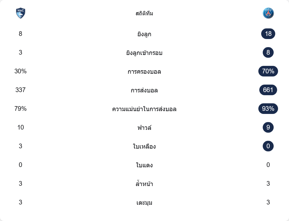 รูปเกมสะท้อนความต่างชัด เปแอสเชเป็นฝ่ายครองบอลมากกว่าแบบขาดลอย 70 เปอร์เซ็นต์ต่อ 30 เปอร์เซ็นต์ และเดินเกมด้วยจำนวนการส่งบอล 661 ครั้ง พร้อมความแม่นยำในการจ่ายสูงถึง 93 เปอร์เซ็นต์ ขณะที่เลอ อาฟร์ส่งบอล 337 ครั้ง ความแม่นยำ 79 เปอร์เซ็นต์ ถึงจะมีบอลน้อยกว่า แต่ยังพยายามหาจังหวะเข้าทำเมื่อมีโอกาส
