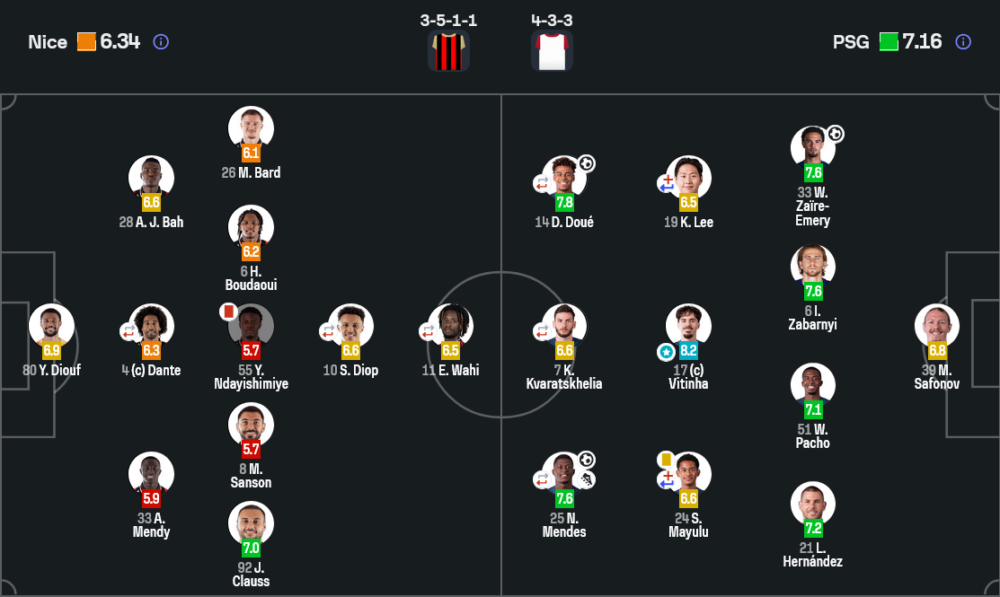เปแอสเชมาในระบบ 4-3-3 ที่ขยับเกมได้ลื่นมาก วิตินญาเป็นแกนคุมจังหวะกลางสนาม ส่วน นูโน เมนเดส และ วาร์เรน ซาอีร์ เอเมอรี ช่วยเติมเกมทางซ้ายได้ดุดัน ทำให้แนวรับนีซโดนบีบตลอด จุดเด่นของทีมเยือนคือการต่อบอลดึงคู่แข่งให้เสียตำแหน่งก่อนแทงเข้าโจมตีในช่องว่าง โดยเฉพาะฝั่งของ ดูเอ้ และ ควารัตสเคเลีย ที่สร้างปัญหาให้เจ้าถิ่นหนักมาก นี่คือภาพของ วิเคราะห์บอล เชิงแท็กติกที่ชัดว่าเปแอสเชมีทั้งโครงสร้างและคุณภาพเฉพาะตัวเหนือกว่า