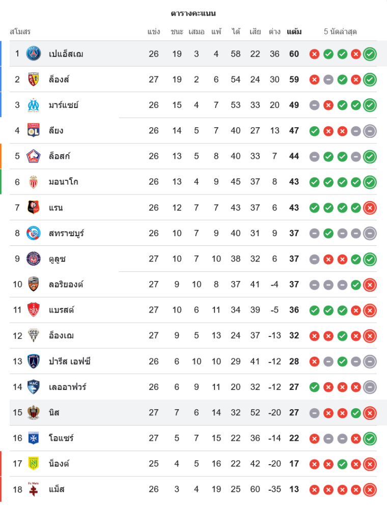 สถานการณ์ในตารางคะแนนลีกเอิง ฝรั่งเศส