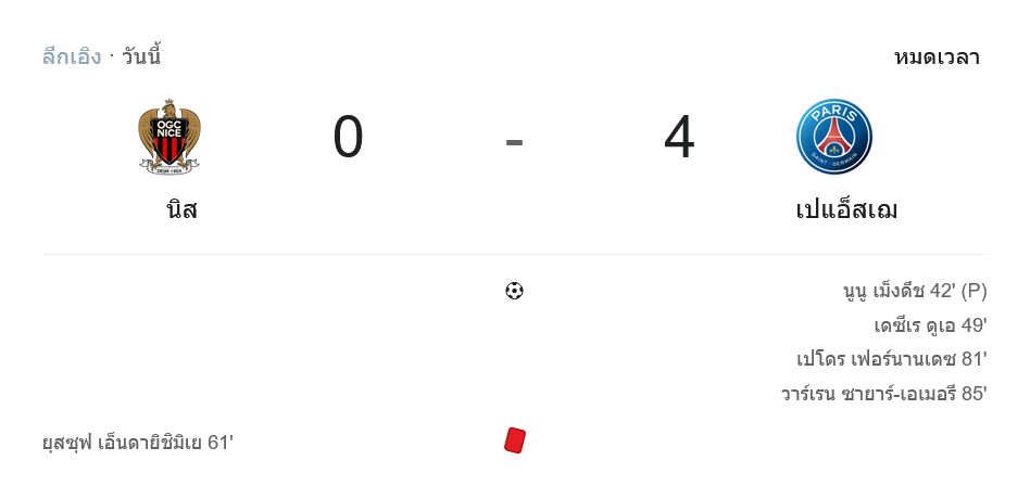 ครึ่งหลังนีซหวังกลับมา แต่กลับโดนหมัดสองเร็วทันควัน นาที 49 เดซีเร ดูเอ้ ยิงให้เปแอสเชหนีเป็น 2-0 จากการจ่ายของ นูโน เมนเดส จากนั้นเกมของเจ้าถิ่นยิ่งหนักขึ้น เมื่อ ยูสซูฟ เอ็นดายิชิมิเย โดน VAR อัปเกรดเป็นใบแดงในนาที 61 ทำให้นีซเหลือ 10 คน และแทบหมดแรงต้าน เปแอสเชเดินเกมต่อแบบไม่ผ่อน ก่อนมาได้เพิ่มจาก ดรอ แฟร์นานเดซ นาที 81 และ วาร์เรน ซาอีร์ เอเมอรี นาที 85 ปิดเกมให้ทีมเยือนบุกชนะ 4-0 แบบเด็ดขาดตามสไตล์ บ้านผลบอล ที่เห็นแล้วต้องยอมรับว่าต่างชั้นจริง ๆ