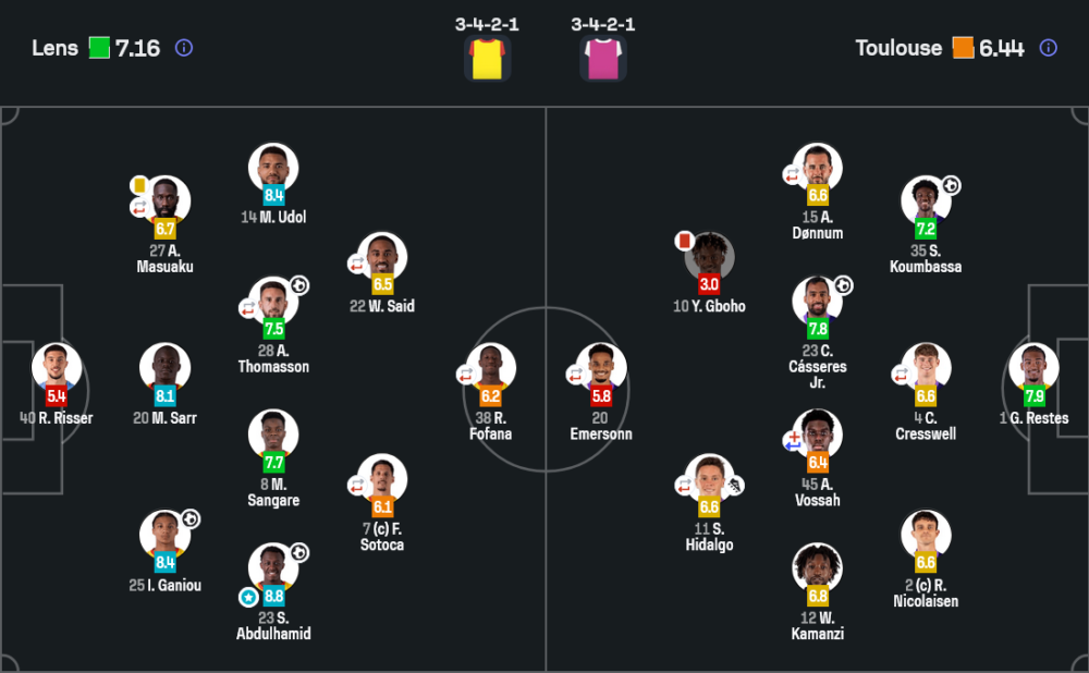 ฝั่งตูลูสก็มาในระบบ 3-4-2-1 เช่นกัน แต่เลือกเล่นแบบเน้นจังหวะสวนและลูกตั้งเตะ ซึ่งได้ผลอย่างมากในครึ่งแรก เพราะทั้งสองประตูมาจากคุณภาพการเข้าทำที่เฉียบคม แต่หลังเสียผู้เล่นไปหนึ่งคน เกมรับเริ่มถอยลึกเกินไป และรับแรงกดดันจากล็องส์ไม่ไหวในช่วงท้าย