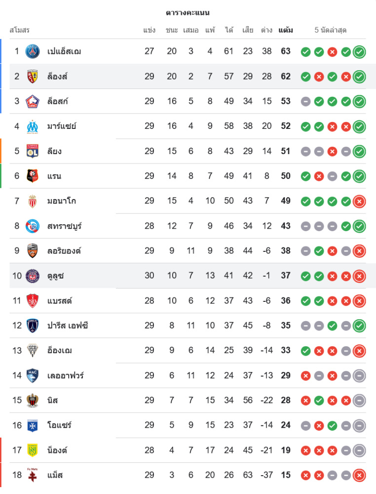 สถานการณ์ในตารางคะแนนลีกเอิง ฝรั่งเศส