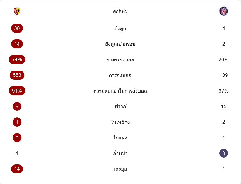 เกมนี้ล็องส์เหนือกว่าชัดเจนทั้งการครองบอลและโอกาสเข้าทำ พวกเขายิงถึง 38 ครั้ง เข้ากรอบ 14 ครั้ง ครองบอล 74 เปอร์เซ็นต์ และจ่ายบอลด้วยความแม่นยำ 91 เปอร์เซ็นต์ ขณะที่ตูลูสมีโอกาสยิงเพียง 4 ครั้ง เข้ากรอบ 2 ครั้ง ครองบอล 26 เปอร์เซ็นต์เท่านั้น เจ้าบ้านยังได้เตะมุมถึง 14 ครั้ง เทียบกับทีมเยือนที่ได้เพียงครั้งเดียว ตัวเลขทั้งหมดสะท้อนชัดว่าแม้สกอร์จะสูสี แต่รูปเกมตลอดครึ่งหลังเป็นของล็องส์แทบทั้งหมด