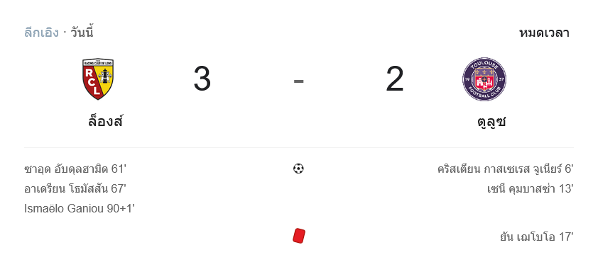 - ⚽ นาที 90+1 อิสมาเอโล กานิอู โหม่งประตูชัยให้ล็องส์แซง 3-2