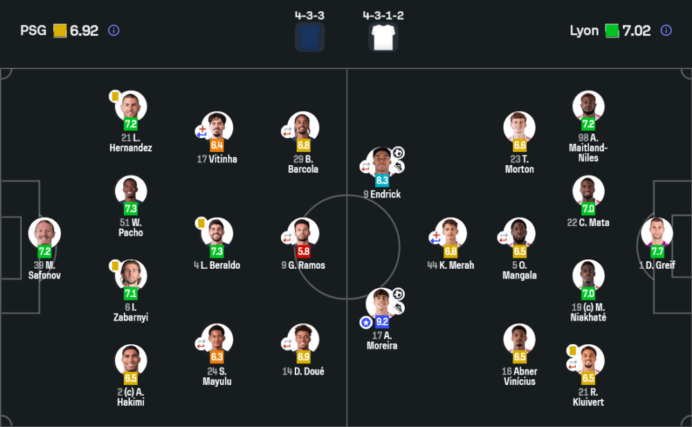 - เปลี่ยนตัว : วอร์แร็ง ซาอีร์-เอเมอรี่ 7.3, คังอิน ลี 6.6, อุสมาน เดมเบเล่ 6.7, ควิชา ควารัตสเคเลีย 8.4, ฟาเบียน รุยซ์ 8.9, ลูคัส เชอวาลิเยร์, มาร์กินญอส, ชูเอา เนเวส, ดรอ แฟร์นานเดซ