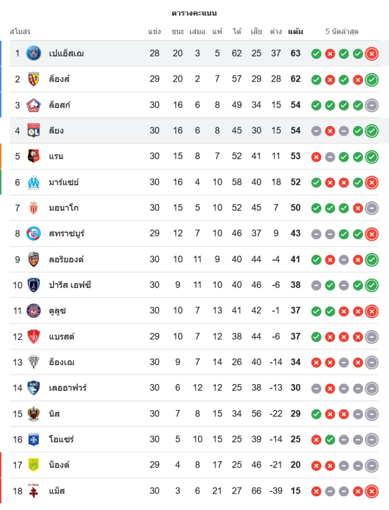สถานการณ์ในตารางคะแนนลีกเอิง ฝรั่งเศส