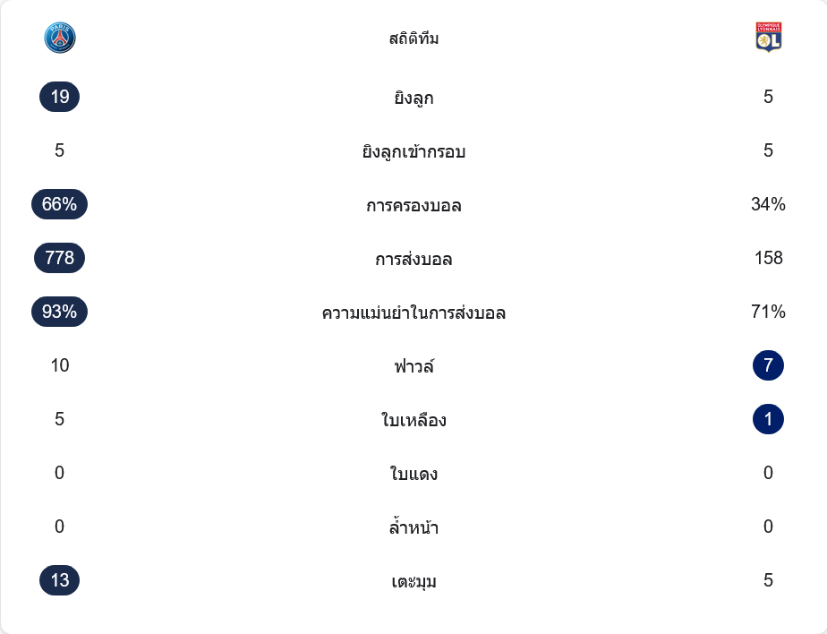 แม้ บ้านผลบอล นัดนี้จะจบด้วยชัยชนะของลียง 2-1 แต่ถ้าวัดจากตัวเลข เปแอสเชคือฝ่ายคุมเกมแทบทั้งหมด พวกเขายิง 19 ครั้ง เข้ากรอบ 5 ครั้ง ครองบอล 66 เปอร์เซ็นต์ ผ่านบอล 778 ครั้ง และได้เตะมุมถึง 13 ครั้ง ขณะที่ลียงยิงเพียง 5 ครั้ง แต่เข้ากรอบทั้ง 5 ครั้ง ครองบอล 34 เปอร์เซ็นต์ และผ่านบอล 158 ครั้งเท่านั้น ภาพรวมจึงชัดมากว่าเจ้าถิ่นแพ้เพราะความเฉียบคม ส่วนทีมเยือนชนะเพราะใช้ทุกโอกาสได้คุ้มค่าที่สุด