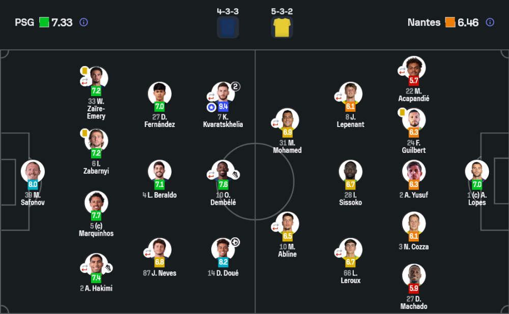 - กองหน้า : อุสมาน เดมเบเล่ 7.6 , ดร็อง เฟร์นานเดซ 7.0 , ควิชา ควารัตสเคเลีย 9.4