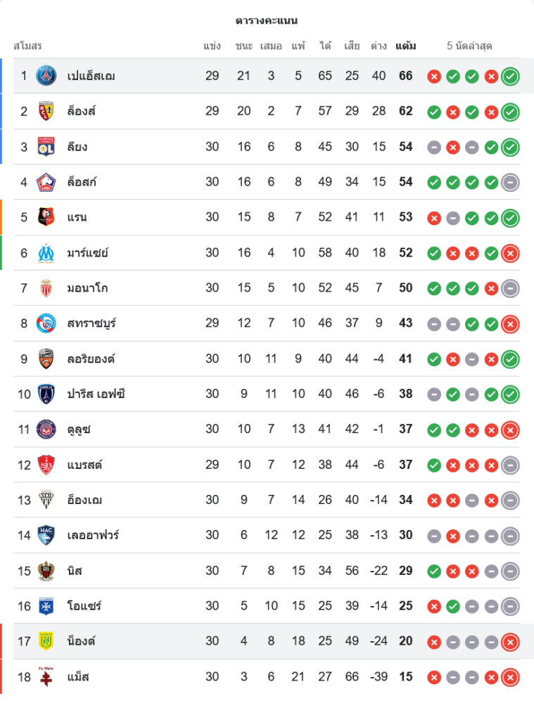 สถานการณ์ในตารางคะแนนลีกเอิง ฝรั่งเศส