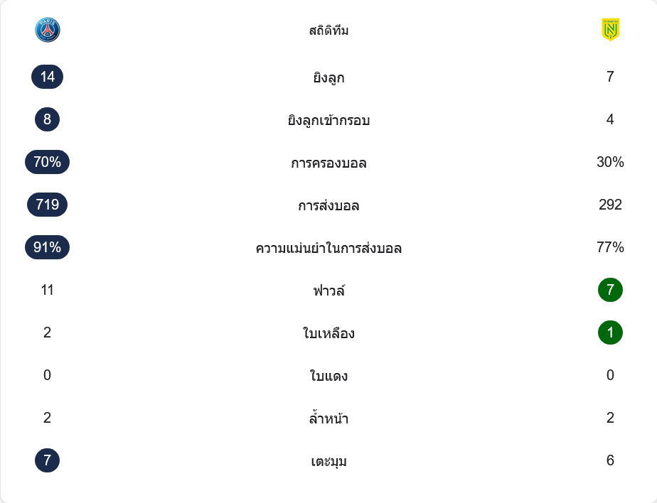 รูปเกมสะท้อนออกมาทางตัวเลขอย่างชัดเจน เปแอสเชยิง 14 ครั้ง เข้ากรอบ 8 ครั้ง ส่วนน็องต์ยิง 7 ครั้ง เข้ากรอบ 4 ครั้ง เจ้าถิ่นครองบอลถึง 70 เปอร์เซ็นต์ จ่ายบอล 719 ครั้ง ด้วยความแม่นยำ 91 เปอร์เซ็นต์ ขณะที่น็องต์จ่ายเพียง 292 ครั้ง ความแม่นยำ 77 เปอร์เซ็นต์ แม้ลูกเตะมุมจะใกล้เคียงกัน แต่คุณภาพเกมรุกและการควบคุมจังหวะยังเป็นเปแอสเชที่เหนือกว่าชัดเจน
