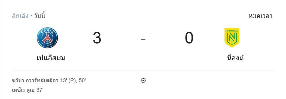 ศึก ลีกเอิง ฝรั่งเศส คู่นี้จบแบบชัดเจน เปแอสเชเปิดบ้านอัดน็องต์ 3-0 จากฟอร์มร้อนของ ควิชา ควารัตสเคเลีย ที่กดสองประตู บวกอีกลูกจาก เดซีเร ดูเอ้ ส่งเจ้าถิ่นเก็บสามแต้มสำคัญและเดินหน้ารั้งหัวตารางต่อไปแบบมั่นคง ขณะที่น็องต์มีจังหวะสู้เป็นระยะ แต่สุดท้ายต้านความครบเครื่องของเจ้าถิ่นไม่ไหว เกมนี้แฟนบอลที่ตามเช็ก ผลบอลสด คงเห็นตรงกันว่าเปแอสเชเหนือกว่าชัดทุกด้าน