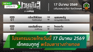 - ดูมวยสด โปรแกรมมวยไทยวันนี้ 17 มีนาคม 2569 เช็กคิวเดือดครบทุกคู่ พร้อมตารางถ่ายทอดสดชัดเจน