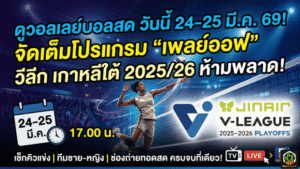 - ดูวอลเลย์บอลสด วันนี้ 24 มีนาคม 2569 เปิดโปรแกรมวีลีกเกาหลีใต้ รอบเพลย์ออฟ เช็กคิวแข่งพร้อมช่องถ่ายทอดสดครบจบที่เดียว