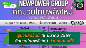 - ดูมวยสดวันนี้ 18 มีนาคม 2569 เปิดตารางเดือดครบทุกคู่ ศึกมวยไทยพลังใหม่ เช็กเวลาแข่งและช่องถ่ายทอดสดที่นี่