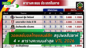 - วอลเลย์บอลไทยแลนด์ลีกเดือดจัด! สรุปผลสัปดาห์ 4 + ตารางคะแนนล่าสุด VTL 2026 ใครนำใครร่วง แฟนๆต้องรู้