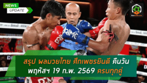 - ผลมวยไทยเดือดจัด! สรุป ผลมวยไทย ศึกเพชรยินดี คืนวันพฤหัสฯ 19 ก.พ. 2569 ครบทุกคู่ อ่านจบรู้เรื่อง