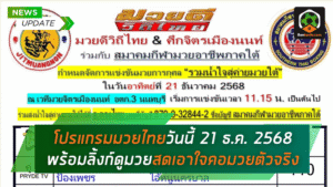 - โปรแกรมมวยไทยวันนี้ 21 ธ.ค. 2568 เปิดจอเชียร์ครบทุกศึก พร้อมลิ้งก์ดูมวยสดเอาใจคอมวยไทยตัวจริง