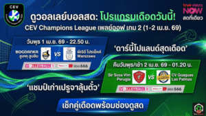 - ดูวอลเลย์บอลสด 1 เมษายน 2569 โปรแกรมเดือด CEV Champions League 2026 เพลย์ออฟ เกม 2 เช็กคู่เดือดพร้อมช่องดูสด