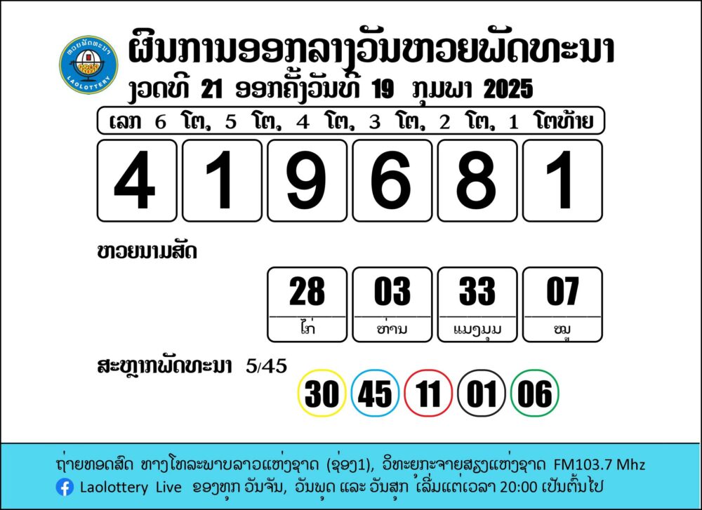 ຖ່າຍທອດສົດການອອກເລກລາງວັນຫວຍພັດທະນາ 19/2/2025