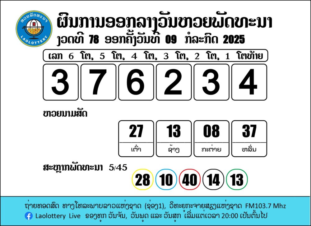 ตรวจหวยลาว (ຫວຍລາວ) งวดประจำวันที่ 09/07/2568