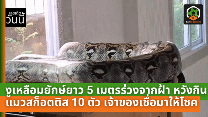 เหตุการณ์สุดระทึกกลางบ้านย่านนนทบุรี เมื่อ งูเหลือมขนาดมหึมายาวกว่า 5 เมตร ร่วงโครมลงมาจากช่องฝ้าเพดาน ขดตัวอยู่บนตู้เก็บของในห้องเลี้ยงแมวด้านหลังบ้าน สร้างความตกใจให้กับเจ้าของบ้านเป็นอย่างมาก โดยเฉพาะเมื่อในห้องนั้นมี แมวพันธุ์สก็อตติส สุดรักอยู่ถึง 10 ตัว! งานนี้โชคดีที่เจ้าเหมียวทั้งหมด ไหวตัวทันเผ่นหนีรอดหวุดหวิด ขณะที่คอหวยก็ไม่พลาด ส่อง “เลขที่บ้าน” หวังรับโชคจากงูใหญ่แบบไม่ให้พลาดแม้แต่งวดเดียว