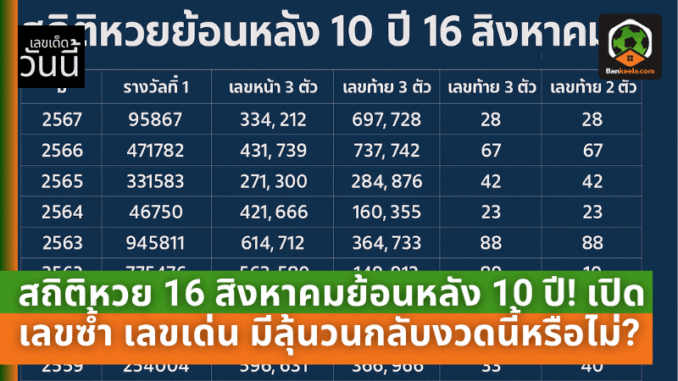 ต่อไปนี้คือ ตารางผลการออกรางวัลประจำวันที่ 16 สิงหาคม ย้อนหลัง 10 ปี พร้อมสรุปเลขที่น่าจับตา: