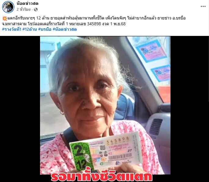 หลังการประกาศผลไม่กี่นาที เพจชื่อดัง “น๊อตข่าวสด” ได้เผยภาพคุณยายในชุดเสื้อเรียบง่าย แต่รอยยิ้มกลับเปี่ยมไปด้วยความสุข พร้อมข้อความสุดสะเทือนใจว่า “แตกอีกรับเนาะๆ 12 ล้าน ยายอุตส่าห์รอลุ้นมานานทั้งชีวิต เพิ่งโดนจังๆ” ซึ่งกลายเป็นไวรัลในกลุ่มคนรักหวยทันที เพราะเป็นเรื่องราวของคนธรรมดาที่ไม่เคยหยุดหวัง และสุดท้ายโชคก็เป็นของเธอจริงๆ
