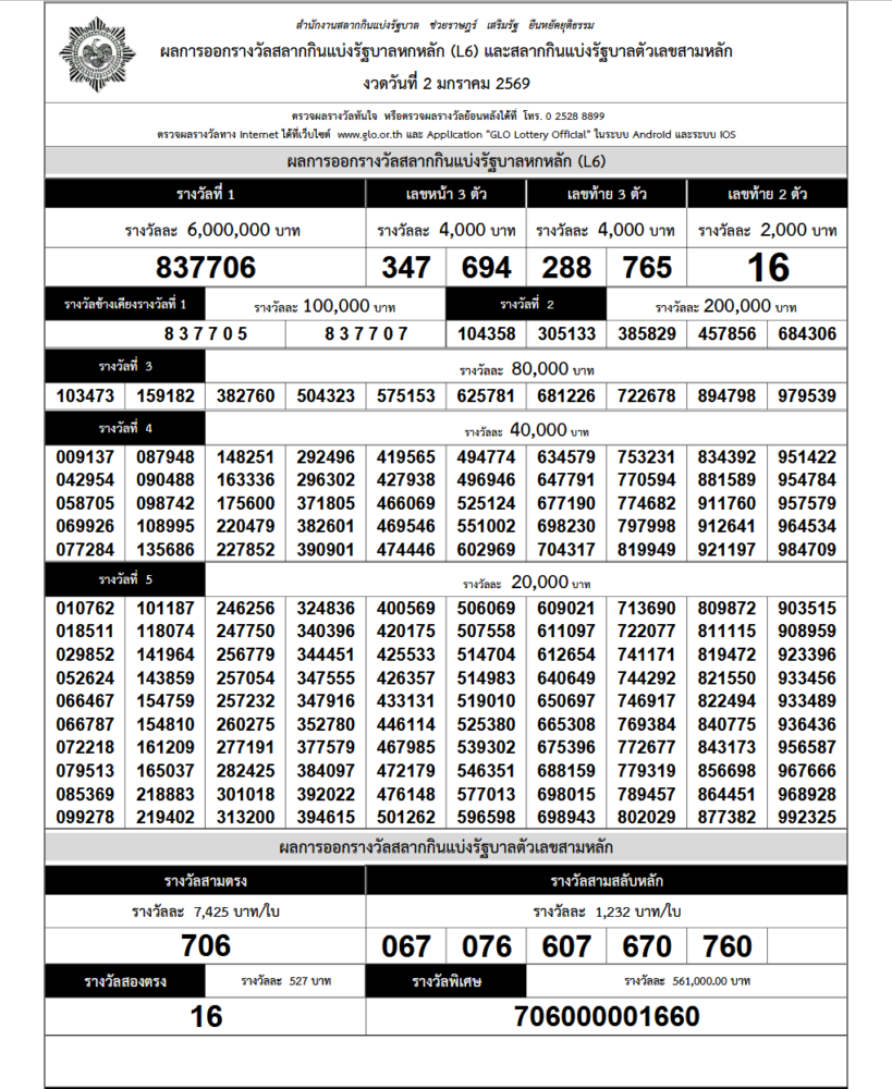 | รางวัลที่ 1 รางวัลละ 6,000,000 บาท | เลขหน้า 3 ตัว 2 รางวัลๆละ 4,000 บาท | เลขท้าย 3 ตัว 2 รางวัลๆละ 4,000 บาท | เลขท้าย 2 ตัว 1 รางวัลๆละ 2,000 บาท |