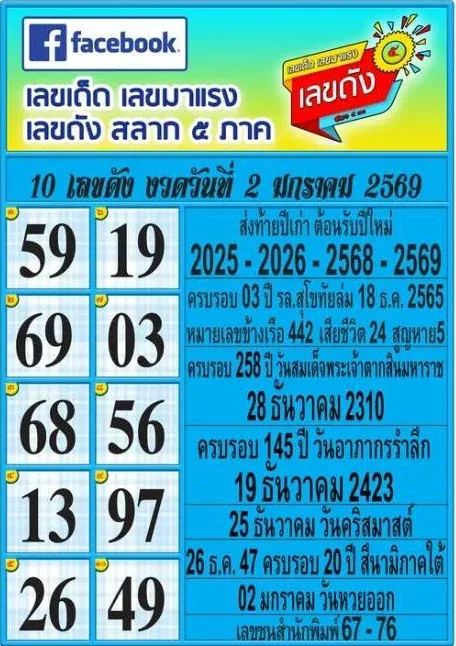 10 เลขดังประจำงวด 2 มกราคม 2569 จากสลาก 5 ภาค ประกอบด้วย