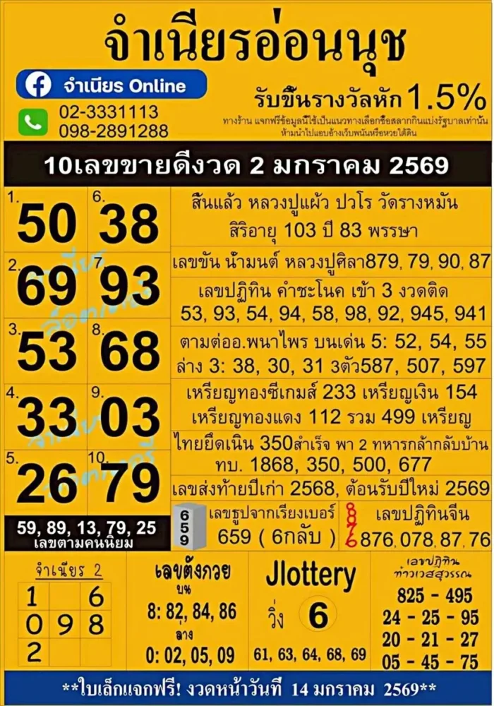 10 เลขขายดี “จำเนียรอ่อนนุช” งวด 2 ม.ค. 69 คอหวยห้ามกะพริบตา รีบส่องก่อนเลขดังเกลี้ยงแผง!