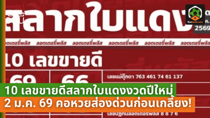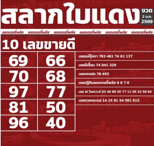 ใกล้ถึงจังหวะลุ้นโชครับปีใหม่กันแล้ว งวดนี้บอกเลยว่าคอหวยทั่วประเทศจับตาไปที่ 10 เลขขายดี สลากใบแดง งวดวันที่ 2 มกราคม 2569 กันแน่นขนัด ใครที่ยังไม่มีลอตเตอรี่ในมือ แต่ใจมันเรียกร้องอยากลุ้น อยากลองเผื่อได้จับเงินก้อนใหญ่ เวลากำลังนับถอยหลังแบบนี้ยิ่งต้องรีบเช็กให้ชัวร์ว่าเลขที่เล็งไว้ยังไม่หมดแผง หรือมีเลขไหนน่าสนใจให้ตามกระแสเพิ่มก่อนถึงวันออกรางวัลจริง