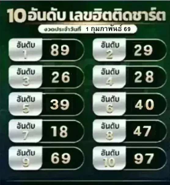 ใกล้ระเบิดศึกหวยรัฐบาลกันอีกครั้งสำหรับ หวยงวดวันที่ 1 กุมภาพันธ์ 69 บรรดาคอหวยทั่วประเทศเริ่มขยับหาเลขในใจ บางคนได้มาจากความฝัน บางคนส่องเจ้าแม่เจ้าเกจิ แต่สำหรับสายสถิติที่อยากเช็กกระแสให้แม่น ๆ วันนี้ บ้านกีฬา ขนข้อมูลเดือด ๆ อย่าง “10 อันดับเลขฮิตติดชาร์ต” มาเสิร์ฟให้ถึงหน้าจอ ใครยังไม่มีเลขในมือ บอกเลยว่าห้ามเลื่อนผ่านเด็ดขาด
