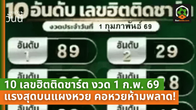 ใกล้ระเบิดศึกหวยรัฐบาลกันอีกครั้งสำหรับ หวยงวดวันที่ 1 กุมภาพันธ์ 69 บรรดาคอหวยทั่วประเทศเริ่มขยับหาเลขในใจ บางคนได้มาจากความฝัน บางคนส่องเจ้าแม่เจ้าเกจิ แต่สำหรับสายสถิติที่อยากเช็กกระแสให้แม่น ๆ วันนี้ บ้านกีฬา ขนข้อมูลเดือด ๆ อย่าง “10 อันดับเลขฮิตติดชาร์ต” มาเสิร์ฟให้ถึงหน้าจอ ใครยังไม่มีเลขในมือ บอกเลยว่าห้ามเลื่อนผ่านเด็ดขาด