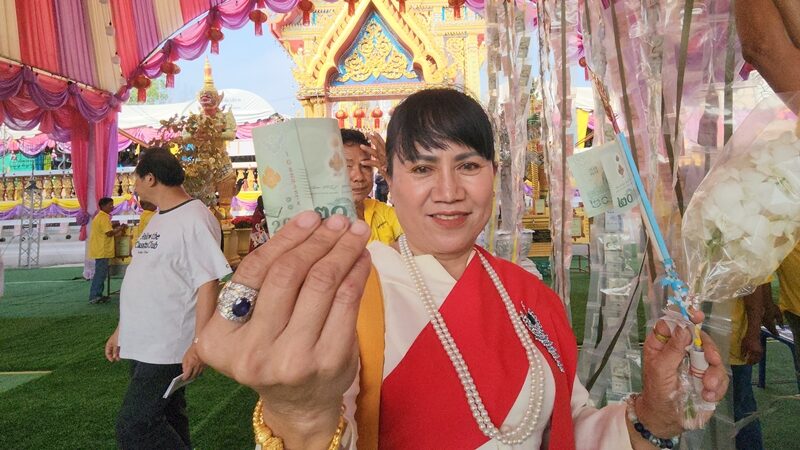 อีกหนึ่งจุดที่คนพูดถึงกันทั้งงานคือ “ผ้าป่าลอยฟ้า” ที่ทางวัดนำจักรยานถีบ 2 ล้อมาดัดแปลงเป็นวงล้อหมุน เพื่อเคลื่อนปัจจัยทำบุญขึ้นไปสู่หลังคาพระอุโบสถ ภาพที่เห็นทั้งแปลกตาและชวนศรัทธา ทำให้หลายคนหยุดดู หยุดถ่ายรูป และบางคนก็เริ่ม “ตีเป็นสัญญาณ” หา เลขเด็ด ตามสไตล์คอหวยไทย