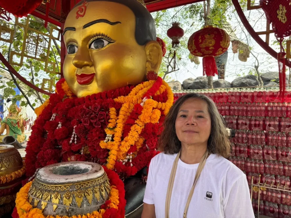 นางศิรินภา ฟุ้งค์ อายุ 66 ปี เดินทางมาจากประเทศเยอรมนีพร้อมครอบครัว โดยนำน้ำแดง ขนม และจักรยานมาแก้บนถวายกุมารทองเจ้าสัวเฮง หลังจากเคยอธิษฐานขอให้ขายที่ดินได้สำเร็จ เจ้าตัวเล่าว่าแม้เป็นคนเชียงราย แต่ไปอยู่เยอรมนีมานานกว่าสามสิบปีแล้ว จึงเลือก “บนผ่านออนไลน์” ขอให้ขายที่ดินได้ตามต้องการ หากสำเร็จจะกลับมาถวายของให้ครบตามที่รับปากไว้