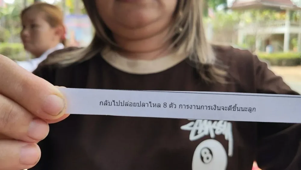 ก่อนกลับทั้งคู่ได้ตักไข่มงคลอีกครั้ง โดยคำทำนายระบุว่า “กลับไปปล่อยปลาไหล 8 ตัว การงานการเงินจะดีขึ้นนะลูก” จากนั้นจุดธูปมงคลแล้วได้เลข 707 ส่วนแฟนหนุ่มได้เลข 257 กลายเป็นอีกชุดตัวเลขที่คอหวยให้ความสนใจอย่างมาก