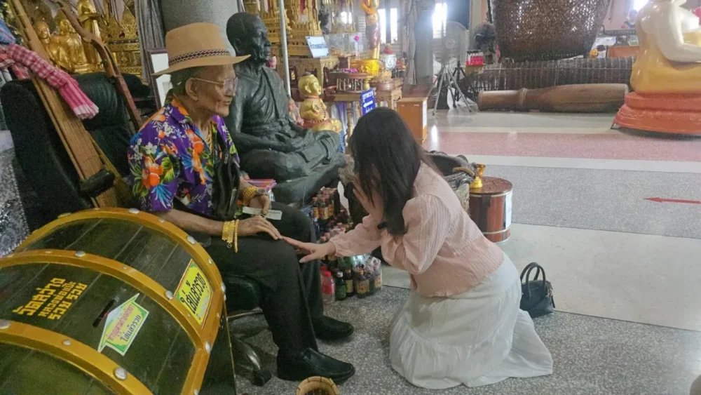 เมื่อวันที่ 10 เมษายน 2569 ผู้สื่อข่าวพบคู่รักหนุ่มสาวอย่าง น.ส.มะเหมี่ยว อายุ 29 ปี พนักงานขายยาและอุปกรณ์การแพทย์ จากสมุทรสาคร และนายมอส อายุ 29 ปี ผู้ทำงานอยู่โรงพยาบาลวิชัยเวช อ้อมน้อย เดินทางมาร่วมกราบไหว้พระเงินพระทองและตาทองงิ้วราย หลังคบหากันมา 1 ปี โดยทั้งคู่เผยว่าตั้งใจมาขอพรล่วงหน้าก่อนวันสงกรานต์ เพราะไม่อยากเจอคนแน่นในช่วงวันหยุด