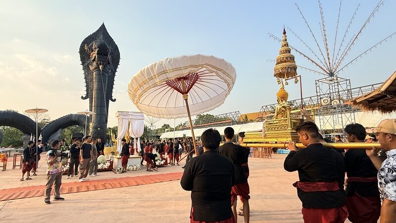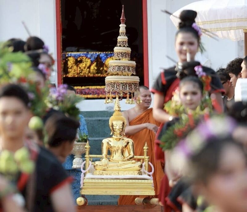 ภายในงานมีขบวนแห่อย่างงดงาม นำโดยกลุ่มชาติพันธุ์ “ญัฮกุร” ฟ้อนรำอย่างอ่อนช้อย ตามด้วยขบวนบายศรี ก่อนอัญเชิญ “พระไชยเทพสถิต” พระพุทธรูปทองคำสูง 19 นิ้ว ให้ประชาชนร่วมสรงน้ำเพื่อความเป็นสิริมงคลรับปีใหม่ไทย