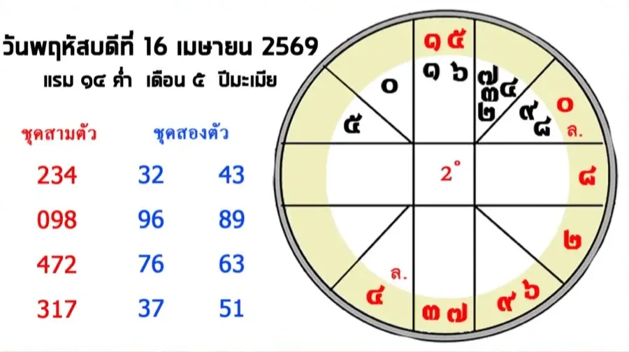 สลากกินแบ่งรัฐบาลงวดวันที่ 16 เมษายน 2569 ตรงกับวันพฤหัสบดี แรม 14 ค่ำ เดือน 5 ปีมะเมีย ซึ่งตามความเชื่อของสายมูและสายตัวเลข มักเป็นช่วงที่สามารถนำพลังของวันและตำแหน่งดาวมาตีความเป็นเลขเด่นได้ จึงกลายเป็นอีกหนึ่งชุดเลขที่ถูกพูดถึงในหมู่คนชอบเสี่ยงโชค