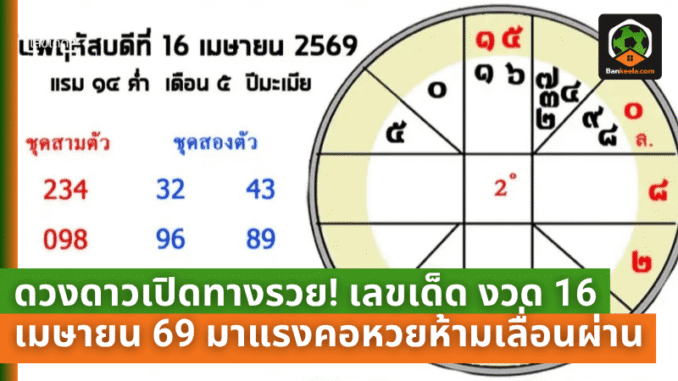 สลากกินแบ่งรัฐบาลงวดวันที่ 16 เมษายน 2569 ตรงกับวันพฤหัสบดี แรม 14 ค่ำ เดือน 5 ปีมะเมีย ซึ่งตามความเชื่อของสายมูและสายตัวเลข มักเป็นช่วงที่สามารถนำพลังของวันและตำแหน่งดาวมาตีความเป็นเลขเด่นได้ จึงกลายเป็นอีกหนึ่งชุดเลขที่ถูกพูดถึงในหมู่คนชอบเสี่ยงโชค