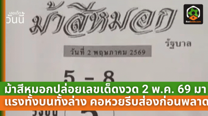 สำหรับงวดวันที่ 02/05/69 นี้ ม้าสีหมอกปล่อยเลขที่น่าสนใจออกมาครบชุด โดยฝั่งบนให้เลขเด่นอยู่ที่ 5 และเลขรองคือ 8 ซึ่งถือเป็นสองตัวหลักของงวดนี้ที่คอหวยหลายคนอาจนำไปแตกเลข จับคู่ หรือใช้เป็นตัววิ่งในการลุ้นต่อ