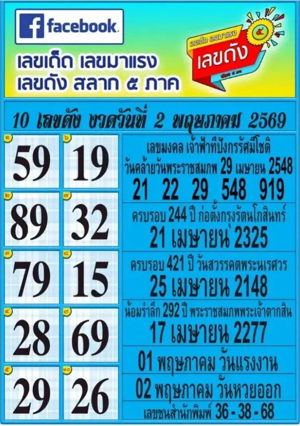 10 เลขเด็ดเลขดัง สลาก 5 ภาค งวด 2 พฤษภาคม 2569