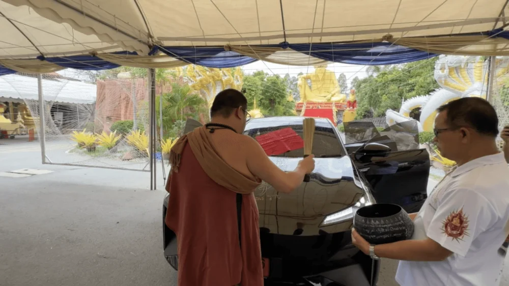 ไฮไลต์ของวันอยู่ที่ “มิสเตอร์ ปิง” นักธุรกิจชาวจีนวัย 30 ปี ที่นำรถไฟฟ้าป้ายแดงคันใหม่มาให้อาจารย์ฤาษีเณรเจิมเพื่อความเป็นสิริมงคล พร้อมเข้ารับพิธีลงพระลักษณ์หน้าทองด้วยความศรัทธา