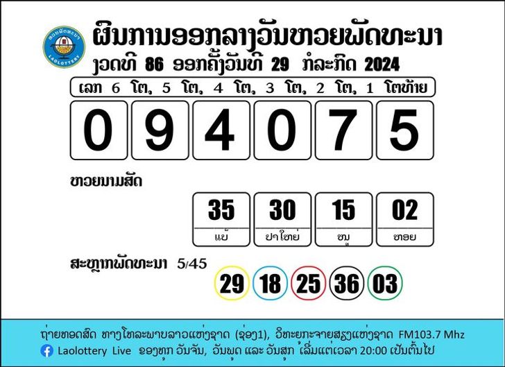 ຖ່າຍທອດສົດການອອກເລກລາງວັນຫວຍພັດທະນາ 29/07/2024