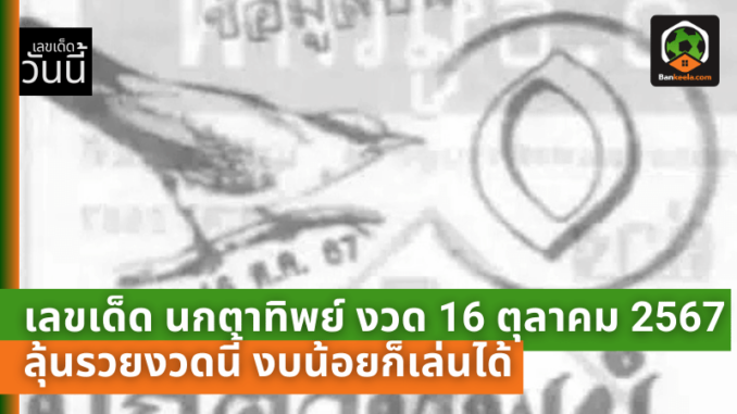 ใกล้วันหวยออกทีไร คอหวยทั่วประเทศต่างรอคอยเลขเด็ดจากหลายสำนักอย่างใจจดใจจ่อ และงวดนี้ก็ไม่พลาด! แนวทางเลขเด็ดจาก นกตาทิพย์ ที่คอหวยและนักเสี่ยงโชคต่างตั้งตารอกันอย่างเนืองแน่น โดยครั้งนี้หวยงวดวันที่ 16 ตุลาคม 2567 จะออกตรงกับวันพุธ ซึ่งถือเป็นโอกาสที่ดีในการลุ้นรวยกลางเดือน คอหวยงบน้อยก็สามารถตามแนวทางนี้ได้อย่างสบายใจ เพราะมีหวังได้จับเงินหลักล้าน