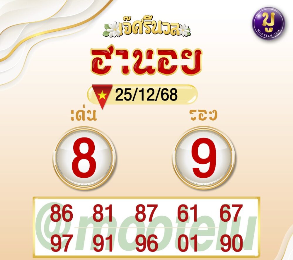 ฝั่ง เจ๊ศรีนวล ยังไม่ทิ้งสไตล์ “โพยอ่านง่าย เลขไม่เยอะ แต่คม” งวดนี้ดันเลข 8 เป็นเด่น และใช้ 9 เป็นรอง ทำให้โทนตัวเลขแกว่งอยู่ในกลุ่ม 8–9–6–7–1 อย่างชัดเจน